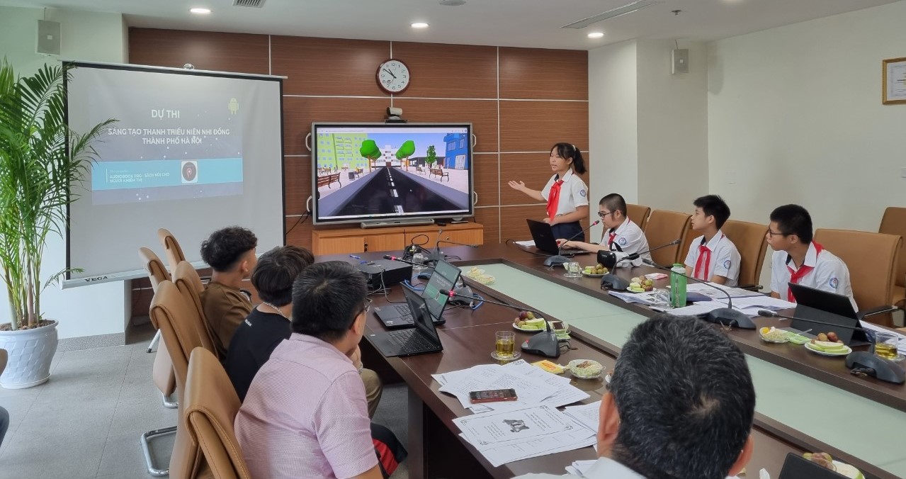 Học sinh trường THCS Ngọc Lâm thuyết trình trước hội đồng chung khảo trong vòng thi tại Hà Nội