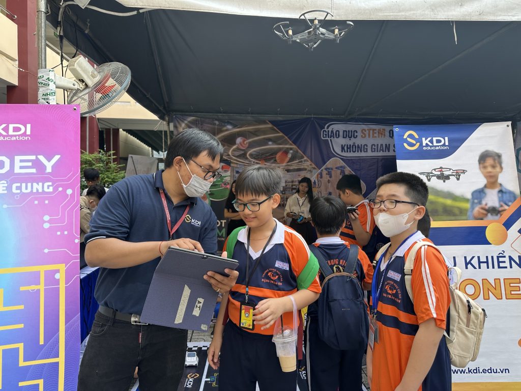 Tại ngày hội, học sinh còn được trải nghiệm nhiều hoạt động thú vị tại gian hàng của các đơn vị đồng hành. Đặc biệt, tại gian hàng của KDI Education, các em có cơ hội tham gia điều khiển drone, lập trình robot codey cũng như trải nghiệm công nghệ thực tế ảo.
