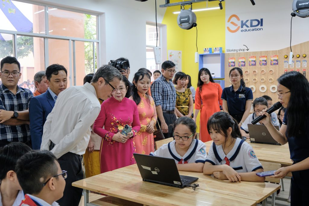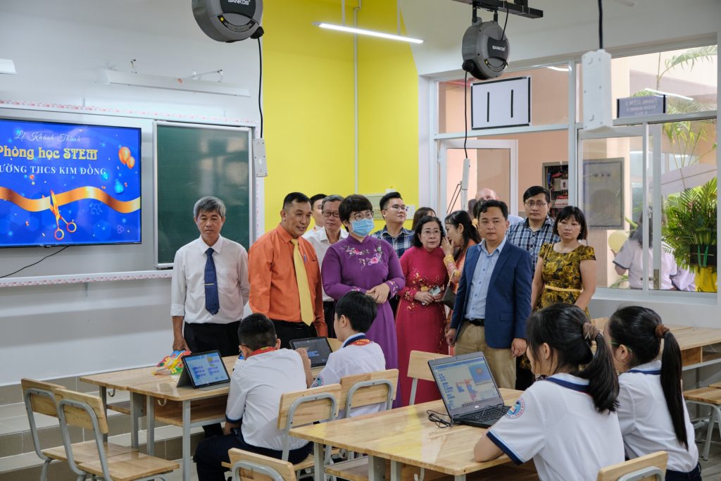 Bà Trương Minh Kiều (áo tím), Phó bí thư Quận Ủy- Chủ tịch UBND Quận 5 tham quan phòng STEM tại trường THCS Kim Đồng