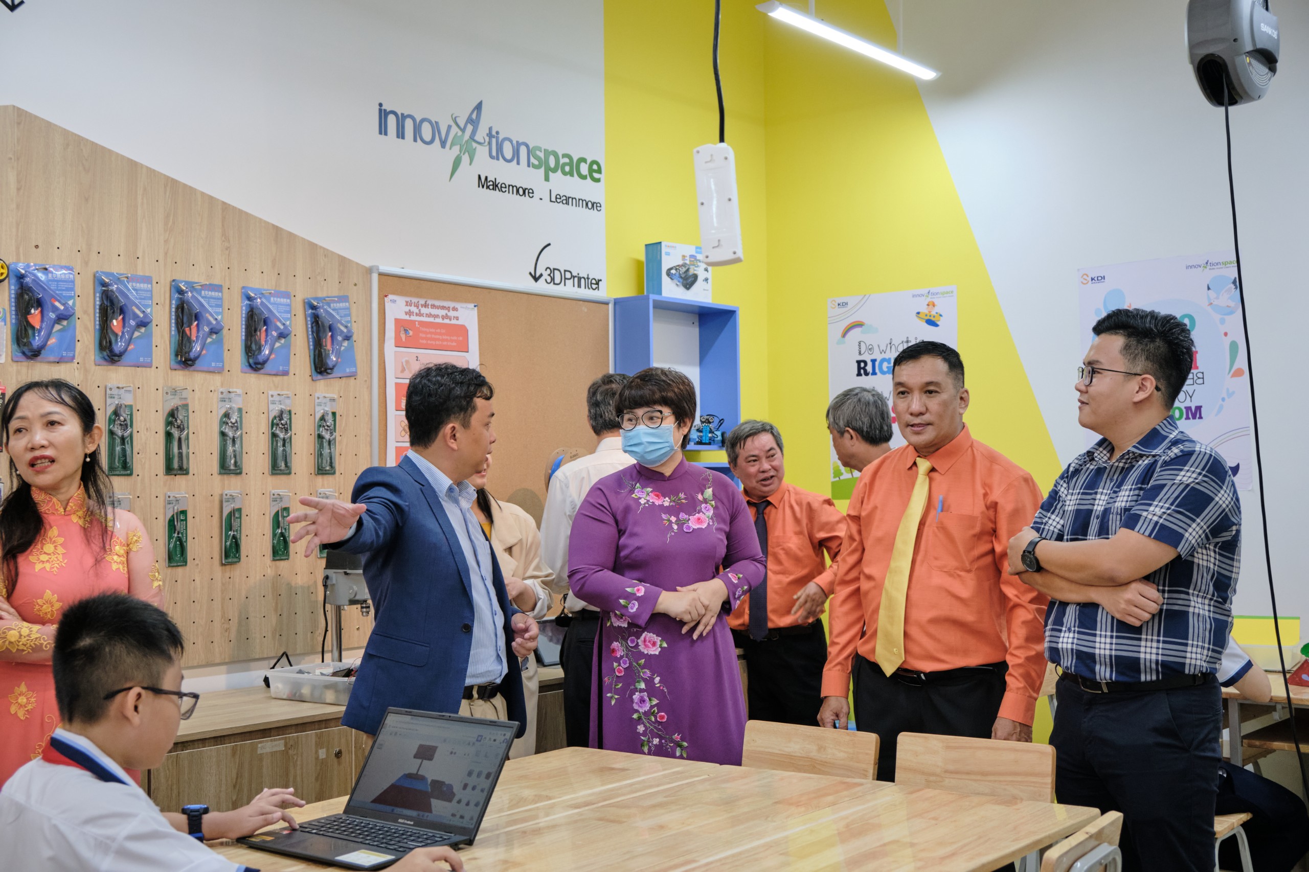 Bà Trương Minh Kiều (áo tím), Phó bí thư Quận Ủy- Chủ tịch UBND Quận 5 tham quan phòng STEM tại trường THCS Kim Đồng