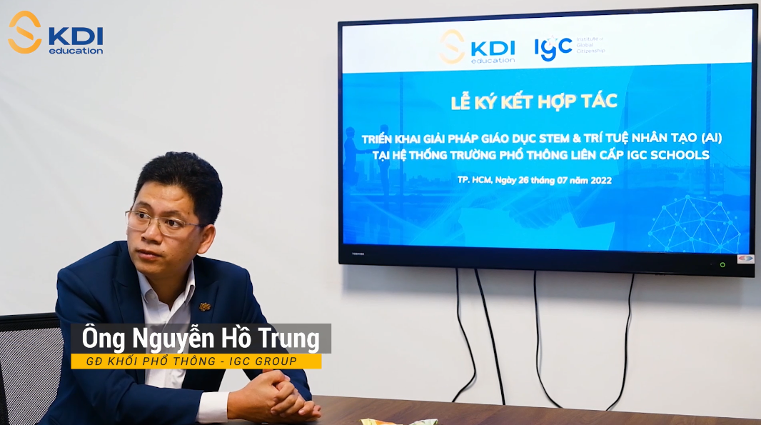 Chia sẻ tại buổi lễ, ông Nguyễn Hồ Trung, giám đốc khối phổ thông IGC Group cũng cho biết: “Trong định hướng chiến lược của IGC Group cũng như hệ thống trường phổ thông liên cấp IGC Schools, STEM là một lĩnh vực giáo dục quan trọng, qua đó giúp cho học sinh phát triển rất nhiều kỹ năng cũng như tư duy giải quyết vấn đề. Đối với việc triển khai các giải pháp giáo dục STEM cũng như trí tuệ nhân tạo (AI) của KDI Education tại hệ thống IGC Schools, chúng tôi kỳ vọng rằng đây sẽ là một sự hợp tác hiệu quả về lâu dài, mang tính kế thừa cũng như liên tục cập nhật để phù hợp với tình hình thực tế của từng năm học”.